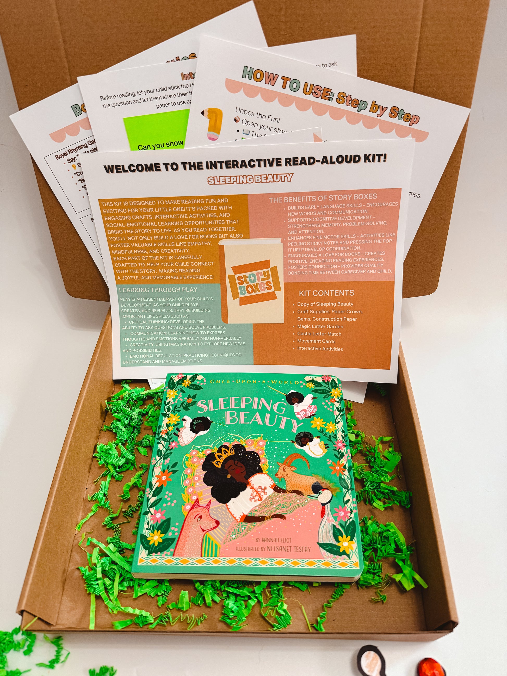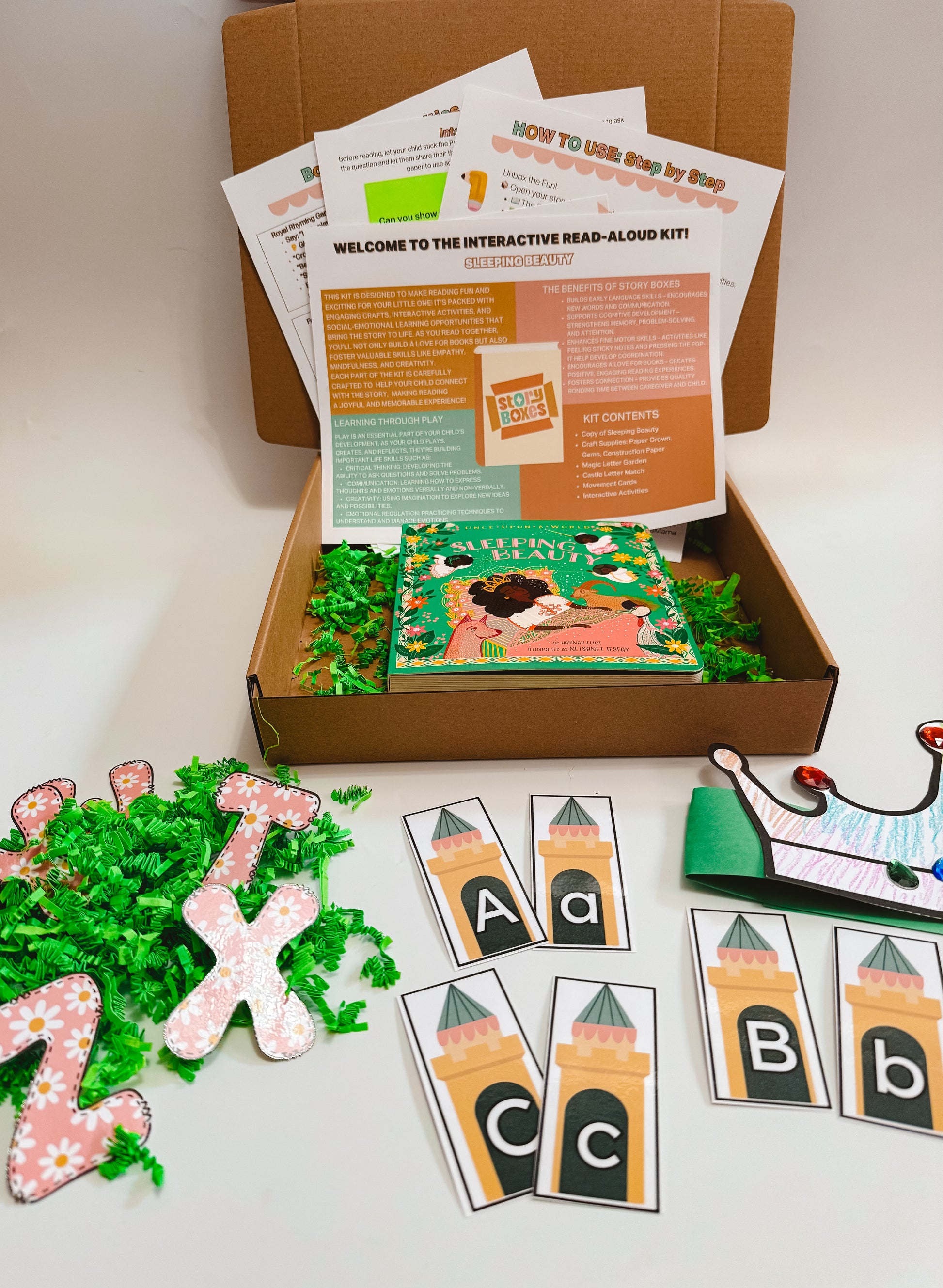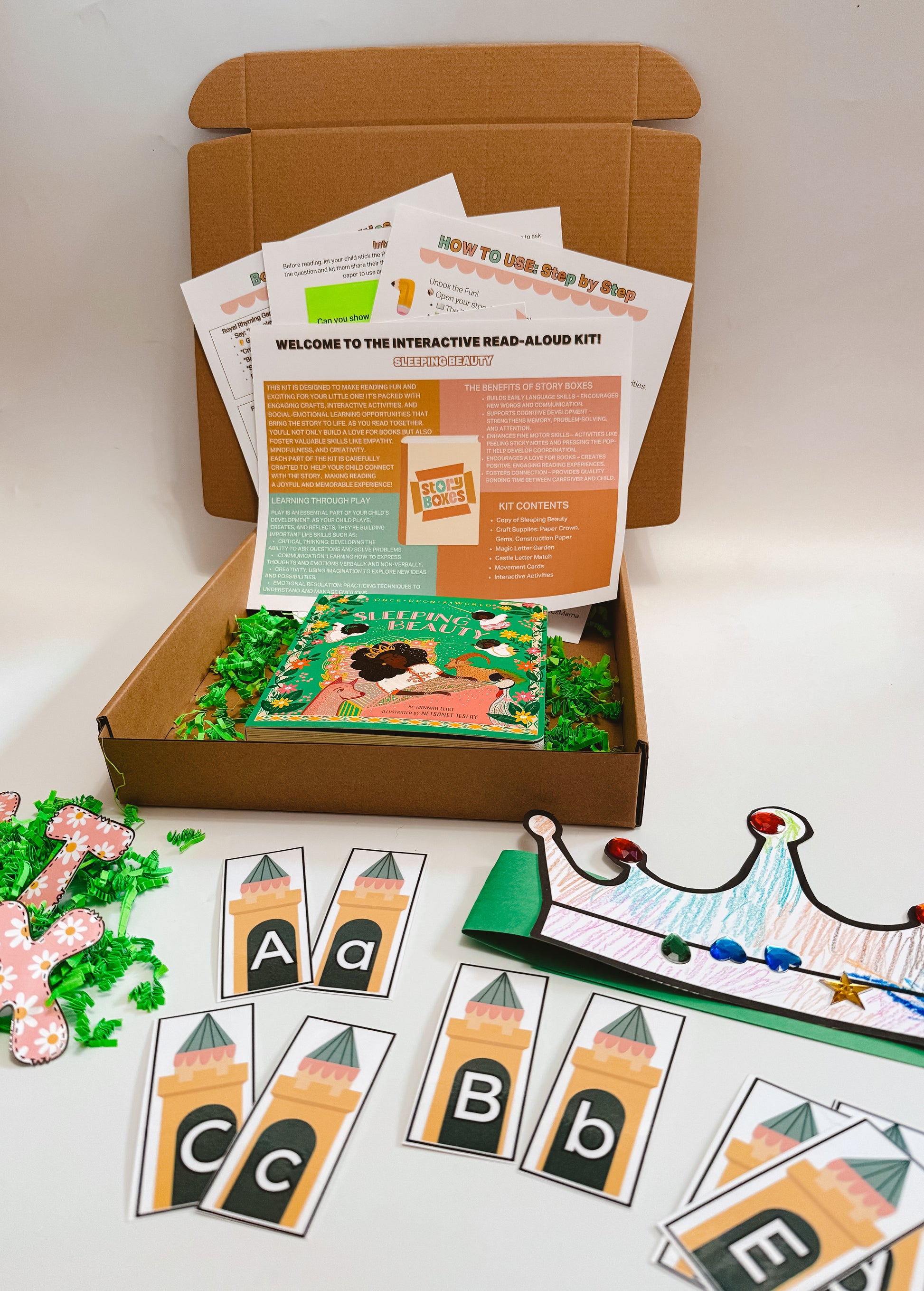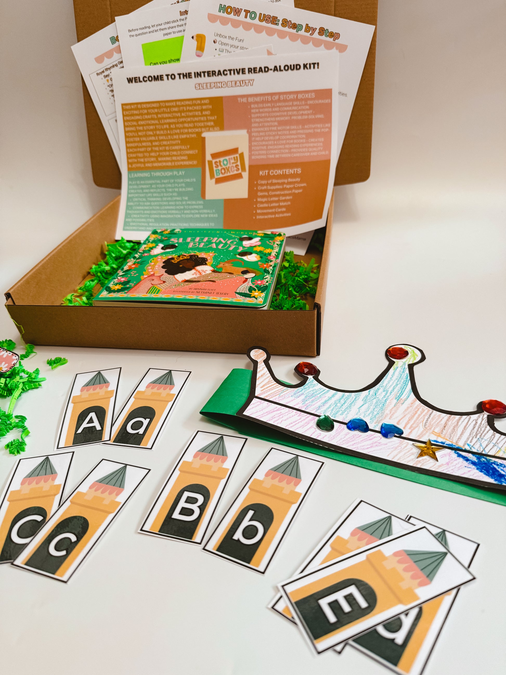 Bring the classic fairy tale of Sleeping Beauty to life with this enchanting story box designed for kids ages 2–4. Packed with hands-on activities, creative crafts, and literacy-focused games, your little royal will explore letters, sounds, and imagination while having endless fun.